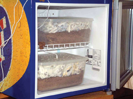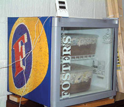 digital thermometer, 2 plastic boxes with lids, play-sand and topsoil. I sited the cabinet in our garage. Using the digital thermometer sensor dangling