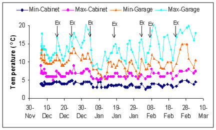 I monitored the maximum and minimum air temperatures within the cabinet and in the garage for the remainder of the 14-week hibernation period (Figure 7).