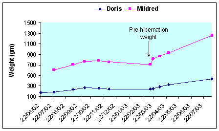 was necessary is unknown. On the 14th March I took the tortoises out of their boxes, weighed them, and placed them under the basking lamp in the greenhouse. Within 1 hour Mildred was eating and within 36 hours, Doris was eating. Within a further day, functioning digestive systems and kidneys were evident. Doris's weight was unchanged from the start of hibernation (245 gm; summer maximum, 265 gm), while Mildred's weight had fallen by 25 gm to 755 gm (summer maximum, 780 gm). Both ate ravenously thereafter and at the end of the following week Doris had gained 10 gm, and Mildred 105 gm (Fig. 8)