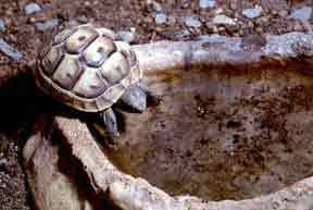 Many people seem to believe that Mediterranean tortoises naturally acquire almost all of their fluid requirement from their food and that therefore they do not require additional drinking water. One recent book on Mediterranean tortoises even suggests that only sick tortoises voluntarily drink fresh water*. It is highly regrettable that such dangerous misinformation is in circulation. This latter contention is simply not true, as direct observations of Testudo graeca and Testudo hermanni in the wild all too easily confirm. Both species are at their most active during or just after episodes of rain, and can be observed to 'nose' along the ground, drinking from any available puddle. Tortoise Trust field trips have resulted in a number of observations of this kind. In Spain, France, Italy and Greece wild Testudo hermanni have been observed in some numbers to drink rainwater and to increase their activity level during wet weather, especially during summer thunderstorms, when the rain brings welcome relief from the searing heat and aridity of summer. In North Africa and Spain (T.graeca), Greece and Turkey (T. ibera), tortoises have been observed drinking from the edges of streams, from reed-beds and from puddles during episodic rain. Recently in Morocco, following the heaviest rain for many years, tortoise activity was as high as I have ever seen it and numerous individuals were observed drinking from surface water. In many arid regions, tortoise activity ceases entirely during summer or in extended periods of drought, and only resumes when rain returns. In southern Turkey, Spain and Morocco, tortoises aestivate during summer because food and water availability is so poor. In southern Africa it is commonplace to see Geochelone pardalis (Leopard tortoises) drinking from streams and pools, and recently Moll and Klemens reported on the utilisation of standing water pools by Malacochersus tornieri (pancake tortoises) in Tanzania.