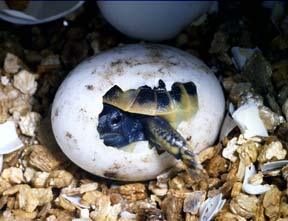 Some female tortoises can be very selective about what constitutes a suitable nesting site. Others are less discerning. In general however nearly all prefer a site which is on a slope, is well drained and has light but relatively well textured soil which is easy to excavate. Very sandy sites, especially those without plant roots to bind the sand together, are often not favoured. The female must be able to dig a bell-shaped excavation without too much difficulty, but at the same time the soil must not be so dry or so loose that the nest collapses in on itself. HOW MANY EGGS DOES A TYPICAL FEMALE LAY? It varies according to the species. Some species only lay a single egg. Others lay up to 30. Even within some species there can be considerable variation - for example, Testudo hermanni boettgeri (the eastern or balkan Hermann's tortoise) usually lays between 6-10 eggs. By comparison, Testudo hermanni hermanni (the western Hermann's tortoise) typically only lays 3 eggs per clutch. On average, most Mediterranean tortoises lay 5 or 6 eggs per clutch, and many are capable of laying 2 or more clutches per season. IS IT IMPORTANT TO KEEP THE EGGS THE SAME WAY UP AS THEY WERE LAID? No, it isn't. At least not initially. Once embryonic development is underway however orientation should not be disturbed. Always handle eggs very carefully- at whatever stage of development. CAN I 'CANDLE' EGGS DURING INCUBATION TO CHECK IF THEY ARE VIABLE? Yes, you can. But we do not recommend that you should. It involves unnecessary additional handling and does not actually make any difference to the final outcome. Rather than subjecting eggs to such examinations, we recommend patience! IF EGGS ARE LATE IN HATCHING AT WHAT STAGE SHOULD I CRACK THEM OPEN TO HELP ANY HATCHLINGS OUT? Our view is that this sort of intervention is rarely successful and is in addition highly dangerous - how can you be sure that the eggs really are 'late'?. If hatchlings are so weak that they are unable to leave the egg unaided then something is already going drastically wrong somewhere. We would look to a genetic incompatibility or poor incubation technique. Anoxia, or oxygen starvation is one possibility. Prevention is infinitely better than the 'cure' in this instance. CAN FEMALE TORTOISES HAVE EGGS EVEN IN THE ABSENCE OF CONTACT WITH A MALE? The short answer is yes, they can, but are in fact less likely to. IS THERE A SAFE MAXIMUM AGE FOR BREEDING FEMALES? Not exactly, but if a female has not had eggs for many years we would be very wary about subjecting her to breeding attempts. There is a high incidence of (fatal) egg-binding in such cases. It is much safer, and considerably more successful, to employ only healthy young females in captive breeding exercises. These very rarely experience any problems and fertility rates are also likely to be much higher. ARE EGGS LEFT LYING ON THE SURFACE EVER FERTILE? Just occasionally. More often than not they are infertile. If no attempt at all was made to nest them properly, it is probable that the female was merely discarding them. SOMETIMES THE EGGS PRODUCED BY MY FEMALES HAVE A ROUGH TEXTURE, ALMOST LIKE THE SURFACE OF A GOLF-BALL. WHAT DOES THIS INDICATE? Such eggs have usually been retained for a much longer time than is normal - or safe. Investigate nest-site availability. This sort of egg usually has a much thicker than usual shell, and in our experience is never fertile. Such eggs are often implicated in egg-binding and can prove very difficult to lay. WHAT INCUBATION TEMPERATURES DO YOU SUGGEST? For most species, the best results are obtained if the incubation temperature is maintained between 30C and 31.5C. Also in this temperature range, a mixed sex brood is most likely to result. Tortoise eggs are subject to ESD or Environmental Sex Determination. In most cases, lower temperatures produce males, higher temperatures result in females. HOW LONG DOES INCUBATION NORMALLY TAKE? As mentioned previously, it depends to a great extent upon the temperature at which the eggs are incubated. In the temperature range suggested, between 8-11 weeks is about average for most species. The lower the temperature the longer it takes. At around 27C for example, incubation can take 18 weeks or more. At temperatures above 34C however there is a grave risk of mortality or deformity among the hatchlings. It is best to incubate at the medium range temperatures suggested. IS HUMIDITY IMPORTANT? The importance varies with species. Those species which produce softer shelled eggs are much more critical in this respect than those which produce hard-shelled eggs. A good example of the former would be American Box turtle eggs which need to be incubated at a very high ambient humidity if they are not to dehydrate. For most hard-shelled eggs, a medium level of humidity is generally adequate. The easiest way to achieve this is usually just to place a damp sponge in a tray of water somewhere with in the incubator itself. HOW LONG DO BABY TORTOISES TAKE TO LEAVE THE EGG? From the time when they initially pierce the egg, it usually takes between 8-24 hours. The first small fracture is to permit air breathing to begin - prior to this time the embryos oxygen demand has been met via permeation through the egg shell. This first small hole is gradually enlarged over the next few hours. The hatchling may then sit in the egg for quite some time whilst its egg sac is absorbed. Until this is absorbed, the hatchling remains especially vulnerable as movement is seriously impaired. DO ALL THE EGGS FROM A SINGLE CLUTCH HATCH AT ABOUT THE SAME TIME, OR ARE SOME LATER THAN OTHERS IN LEAVING THE EGG? There can certainly be a considerable delay between emergence of the first hatchling and the last - in the case of Mediterranean tortoises we have experienced periods of up to 18 days and even longer may be possible. With some tropical species the time scale can be very extended indeed. This effect is noted even in highly accurate and stable incub