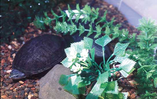 In captivity we want to provide these turtles with an environment that will most closely resemble the conditions of their wild habitat and keep stress to a minimum. Because of their small size, a shallow plastic storage container can meet their needs nicely. They can also be set up quite attractively in an aquarium. Individual personalities differ. Some stinkpots are quite curious and responsive, others are very shy and secretive, but in either case, giving them plant cover in the tank will reduce stress and make them feel more secure. I use small smooth stones as a substrate in my set-up, and soft fern-like plastic plants that trail over sections of the water, which is kept at a depth that allows them to easily reach their head up to the surface while standing on the bottom. As a chiefly nocturnal species, a basking spot is not required. These turtles have also been kept successfully in ambient light without UV-B, but if additional UV-B lighting is desired, a means for retreat should be provided. Such lighting will be necessary if live aquatic plants are included. A piece of cork bark wedged well above the water-line across one side of the tank could provide such retreat, and would also enable the turtle easy access to the surface beneath it for breathing. The inclusion of a riverbank could be added by grading the substrate in a portion of the tank. In the wild, S. oderatus may emerge from the water, often just partially. Such an area with a portion of suitable substrate could also provide a nesting site for gravid females.