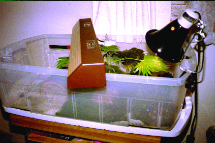 Some Indoor Housing Ideas by Barbara Schreiber Raising a tropical tortoise in the city of Chicago, Illinois, U.S.A., is very challenging, to say the least. Our severe winters make it impossible to keep tortoises outdoors year-round, and furnaces that operate on and off for 24 hours a day during this time of year really take a toll on indoor humidity. And even though our summers are always hot and very humid, tortoises that must live indoors are faced with low humidity, once again, due to air conditioning. As a first-time tortoise keeper, I would like to share my experiences with successfully raising a baby Red-footed tortoise (Geochelone carbonaria), named Horace, in this, often harsh, climate. When I decided that I wanted a baby tortoise, the first thing I did was read up on the subject. This initial research was probably the most enjoyable and exciting part of preparing for my new companion. I narrowed down my choices by eliminating species whose needs I could not meet, and by focusing on those that had qualities that interested me. Species that required hibernation were also crossed off my list, since this is a technique with which I am unfamiliar. Lastly, I wanted a tortoise species with a friendly and responsive personality that would interact with me. In the end I decided upon a Red-footed tortoise (Geochelone carbonaria). I acquired my captive-raised baby Red-foot from a reptile shop in July of 2002. He was only 1.5” in length and appeared to even still have his egg tooth! My first challenge was getting Horace home comfortably, as the store clerk placed him in a brown paper bag and stapled the top closed, even though it was about 90° F that day. I quickly opened the top of the bag and left the car windows open during the ride home. As soon as Horace arrived, I soaked him in a margarine tub lid filled with room temperature water. He immediately dipped his tiny head in and took a long, deep drink. Horace’s housing was simple—a large Rubbermaid storage container (25.5” L x 16” W x 9” H) lined with black-and-white newspaper, a clump of sphagnum moss in one corner, a margarine tub lid for his food dish, and a lid from a cake frosting can for his water dish. A thermometer at each end, humidity gauge, heat lamp, ReptiSun 5.0 UVB light, cuttlebone, artificial palm tree for shade, and hideout log for shelter completed his set-up. Two months later I covered half of the housing floor with sphagnum moss upon the advice of Horace’s veterinarian, who specializes in tortoises. About one year later, I moved him into a larger “jumbo” Rubbermaid storage container that measures 34” L x 20” W x 10” H. This housing is set-up the same way as the first, except for a larger amount of sphagnum moss, larger water and food dishes, and the removal of Horace’s hideout log after he got himself wedged in there one morning while trying to turn around inside it.