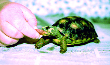 Since Horace does not have the luxury of a tortoise garden in our small backyard, feeding can also be a challenge. His staple diet consists of high-calcium greens. For variety, I offer Hibiscus flowers and leaves, and pre-packaged salad mixes, such as “Field Greens,” which contains romaine lettuce, endive, escarole, radicchio, and carrots. Weekly trips to the salad bar also provide a wide variety for Horace in the form of fruits and vegetables. Additional offerings include Walkabout Farms baby forest tortoise mix, and hay (veterinarian recommended) in the form of bottled pellets, which is great for people with allergies. Once per week, Horace is also offered a small amount of soaked Rep-Cal tortoise food, which he absolutely loves. Sprinkling his food with apple juice offers additional variety and gets him to eat items he is not particularly fond of – like most tortoises, Horace definitely has his favorite foods. I also supplement Horace’s diet with Rep-Cal multivitamins and phosphorous-free calcium with vitamin D3, which is mixed together in a saltshaker. I always try to give him a surprise each day by offering something different in his salad. Horace has a very hearty appetite and eagerly waits for me each morning in anticipation of his breakfast. On weekends he makes lots of noise by “climbing” the sides of his enclosure so that he is standing up on his hind legs and then falls down with a loud “thud.” Horace does this deliberately, it seems, to wake me up (he lives in my bedroom) so that I will get out of bed and make his salad for him! For exercise, which is always supervised, Horace has the run of our small backyard during warm summer days. Unfortunately, due to predators of the human kind, Horace cannot be left to live outdoors all summer. When he was smaller, one of his playful antics included climbing up on top of his hideout log and sliding down the other side. Horace responds to his name (although the vet thinks he may be female), stretches his neck up as far as he can in order to be petted on top of his little head, and readily eats from my hand. Because he is so responsive and friendly to everyone in our family, Horace can easily be considered a “family pet.” Future plans for Horace’s habitat as he grows to adult size include an industrial-sized plastic tub filled with sphagnum moss and furnished basically the same way as he is set-up now. For humidity, I have purchased an automatic mister that will cover the larger area more adequately, and may even add a waterfall-type water dish. I prefer plastic tubs for tortoises that require high humidity because they are easy to wash and keep clean, and also because wood tends to become moldy. Horace is now about one-and-a-half years old, and his recent trip to the veterinarian confirmed that he is in excellent health, has normal shell growth, and is parasite-free. Horace seems to be well on his way to living a long, healthy life, and I hope to enjoy his companionship for many years to come.