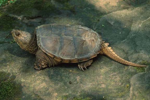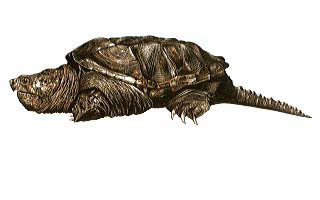 The head of snapping turtles is approximately triangular, and the mouth is large, with sharp jaw surfaces adapted mostly for cutting. (5) Turtles have no teeth. (9) Several barbles are located on the chin. (5) Those probably serve as an increased surface for oxygen uptake. (9) The neck is very long (about as long as the carapace), and so is the tail which has three rows of spines (tubercules) on the upper (dorsal) side. The four legs are very short and massive with large curved scales on the front edges. (5) As a turtle moves forward they lie flat against the skin, but when it pushes backwards with its legs in a swimming motion they stand up and provide an increased surface to push against. (9) The feet are webbed and about as large as a human hand in large individuals. They have 5 claws on each of the two front feet and 4 on each of the hind feet. (9) The underside (ventral side) of snapping turtles is very delicate and soft, and covered with numerous papillae again to increase the area for oxygen uptake. (5,9) The coloration of snapping turtles ranges from almost black to light coffee brown for all the dorsal surfaces. The soft skin underneath is yellowish to light brownish, sometimes even with a reddish tinge. The jaws have black stripes. (5,9) Males and females look very similar, although females have their cloacal opening (the combined opening for both the excretory and reproductive system) much further forward. (5) A mathematical relationship can be usually used to identify the sexes, but pollution with persistent environmental chemicals changes this characteristic making identification difficult if not impossible. (9) (56) Because of their longer period of optimum growth and higher survival (most females are killed on roads during nesting migrations after only a few years of nesting) males generally tend to be larger than females. (9) Snapping turtles have an extremely good eyesight both above and under water. They can even see straight above their heads because of the position of their eyes. (2,9) They also hear very well. Their ears are located in the normal location on the skull, but lack external structures and are therefore not readily visible. (9) Anecdotal accounts also testify to the fact that snapping turtles probably have an extremely good sense of smell or taste. (9) Snapping turtles are a bottom walking species, which means that instead of swimming they crawl or bounce along over the bottom in shallow water. (11) They can only float as long as they hold a significant amount of air in their lungs. (9) Local Habitat: Snapping turtles are highly aquatic and spend most of their lives in the water, except when they crawl out on logs to sun themselves. (6) This behavior (called basking) occurs frequently in northern populations where turtles use it to warm themselves up to increase their metabolic rate and rate of energy assimilation so that they will have enough fat reserves for the winter. (14) They prefer obstructed or covered areas to live in and prefer the bottom of rivers and lakes with soft mud (very important), organic debris, dense vegetation, and water lilies. (10,11,15,16,17) However, they can readily adapt to a wide variety of habitats and are found practically in any permanent or semi-permanent non-moving or slow-moving body of water (ponds, lakes, marshes, swamps, ditches, puddles, salt marshes), as long as the water depth is great enough to allow them to hibernate below the ice, and cover or camouflage is available. (6, 11, 18) Snapping turtles live a sedentary life style (2, 16) They prefer to be able to reach the surface with their head while sitting on the bottom, and are therefore usually found only in water up to 3 feet (1m) deep, with depth of only 20 inches (50 cm) preferred in many cases, and a maximum possible water depth of 8 feet (2.5 m) (they only swim across deep areas but do not live in them). (6, 16, 17) Hatchlings and juveniles live small streams with very shallow water and densely vegetated areas where they can reach the surface while standing on the bottom (up to 20 inches / 50 cm in depth for larger juveniles) (6, 15, 19) Both hatchlings and juveniles are poor swimmers, and all snapping turtles can drown if the can no longer reach the surface. (19) As the turtles mature they migrate to ponds, rivers, marshes, and the shallow areas of large lakes to establish their adult territory. (6) Adults generally avoid the shallow juvenile and hatchling habitats, a behavior called habitat partitioning. (15) Snapping turtles can go for up to 2 weeks without water, which enables them to make long overland migrations, or to swim in the ocean. (6) They can even live in salt water or brackish water but have to periodically return to fresh water to rehydrate. (6, 20) Snapping turtles are one of the few species, which can also live in significantly polluted habitats, including sewer systems. (21) Range: Snapping turtles can live in any still or slow moving body
