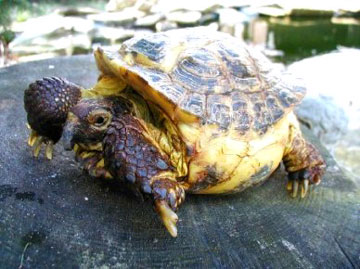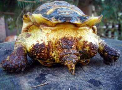Russian tortoise (Testudo horsfieldii) raised in a vivarium tank and fed on lettuce and fruit. There is severe reduction and deformity of the carapace, typical of a diet that was grossly deficient in calcium and/or vitamin D3. The beak is also severely overgrown. Fishtank-type vivaria are NOT appropriate environments for terrestrial tortoises (see 'A Habitat for Horsfields' elsewhere on this website). Many thanks to tortoise rescuer Marty La Prees for donating this photograph. The tortoise is now in a suitable environment on a proper diet. Unfortunately, the deformity can never be reversed.