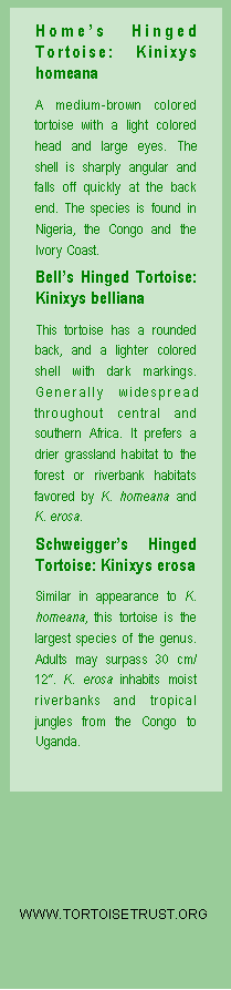 All species of hinge-back tortoise require constantly warm surroundings. K. belliana can tolerate drier environments than either erosa or homeana which both require very high levels of humidity. Failure to provide this will result in severe eye inflammation, possible respiratory problems and kidney disease. Hinge-back tortoises which are kept too dry will remain lethargic and inactive. An occasional spray of fine mist from a hand plant sprayer is also appreciated by most specimens. Access to water for bathing, or regular soaking is also highly recommended. Temperatures for Kinixys should be maintained at circa 24ºC - 27ºC (75ºF - 81ºF) fairly constantly - although some K. belliana enjoy an occasional session of basking under a 'hot spot' of up to 28ºC (83ºF). Most hinge-back tortoises, especially K. erosa and K. homeana, actively dislike bright light and prefer a well shaded, warm and very moist habitat. A peat and leaf-litter substrate is ideal for these species. Unlike most land tortoises, African hinge-back tortoises are omnivorous and are insectivores. In the wild their diets include snails, slugs, millipedes as well as fallen fruits, grasses and plants. In captivity all three commonly encountered species generally enjoy earthworms, mealworms, slugs, bananas, tomatoes, peaches, mushrooms, lettuce, melon and sliced orange. A small quantity of low fat dog food is also appropriate for this species but excessive amounts must not be given otherwise carapace deformities and liver or kidney damage may result. Live food in the form of crickets, snails, earthworms and zoophobas should also be provided at least once per week. Rapidly growing specimens, and egg-laying females, should be provided with a calcium supplement such as 'Repcal®' daily. Do not mix hinge-back tortoises with other species and check specimens regularly for parasites; these species are highly susceptible to "worms" and other internal parasites, such as flagellate organisms.