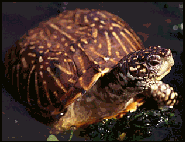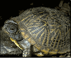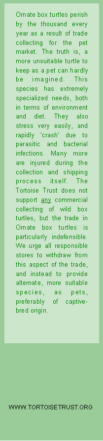 Ornate box turtles are among the most sensitive and difficult of North American species to maintain successfully. We do not recommend this species for beginners. They inhabit a variety of environments, from grassy plains to damp forest floors. They make extensive use of burrows and microclimates. Glass aquarium tanks are categorically not appropriate for this species. They do best in carefully landscaped outdoor enclosures, or in large, indoor terraria with adequate substrate depth. For a substrate, we recommend light peat-based potting compost mixed with damp sphagnum moss. This should be at least 3-4" (75-100 mm) deep. It is imperative that Ornate box turtles are not allowed to become dehydrated - so dry tanks with excessive heat are a major source of problems. Ensure that box turtle habitats are provided with plenty of shade, have a shallow 'soaking' tray of fresh, clean water permanently available, and that temperatures are maintained from 80-85 ºF in one area to approximately 70 ºF in another. On no account over-heat or allow dehydration to occur. Spray the area regularly and ensure that the substrate retains adequate humidity at all times. Environmental problems usually manifest as swollen and infected eyes, ear abscesses and kidney diseases. As virtually all box turtles sold are wild-caught, parasitic diseases are also very common. Look out for Bot fly larvae infections, flagellate infestations and nematodes (intestinal 'worms'). All will require treatment from a specialist veterinarian. Ornate box turtles are highly carnivorous. Provide calcium-dusted crickets, mealworms, waxworms and earthworms on a regular basis. Pinkie mice are also very important. Over-ripe fruits and green-leaf salads are also essential.