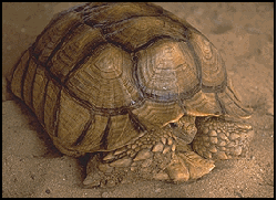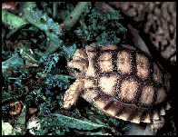 Geochelone sulcata is the largest continental land tortoise with recorded carapace lengths to 83 cm (over 2.5 feet) and a maximum recorded weight of 105 kg (about 240 lbs.). African Spurred tortoises like (and need) space - lots of it. They are also extremely strong animals, so flimsy accommodation is definitely out of the question. All fixtures and fittings must be firmly bolted down and all fences and walls must be sufficiently resilient to resist the effort which will undoubtedly be directed at overcoming them! Our own Spurred tortoise house consists of a 2m X 2m (6' X 6') indoor grazing area, a secondary 2m X 2m sleeping quarters and a 7m X 4m (20' X 12') outdoor grazing area. This we consider adequate for 2 medium sized adults. Juveniles may be maintained out of doors in protected, secure enclosures whenever the weather permits, or indoors in open-topped pens. Like many tortoises, G. sulcata juveniles do not usually respond well to enclosed vivariums. An attractively landscaped open-topped enclosure provides both security and a stimulating, well ventilated environment.