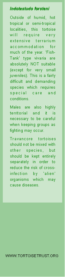 In the wild, Indotestudo forsteni (sometimes referred to as Geochelone or Testudo travancorica) typically occurs in upland tropical forests where the humidity is high, although sometimes it is also found in drier conditions. It is most active during the early part of the rainy season (when breeding also occurs). This tortoise typically avoids strong sunlight, and does not normally seem interested in basking facilities (although, given its wide distribution, regional preferences may exist). As in the wild, peak activity is often seen following heavy, warm, summer rain. Daytime environmental temperature should be maintained in the 26 - 30°C region during summer (78 - 86 °F). In winter, daytime temperatures can be reduced to 24 °C (75 °F) . At night, temperatures can be reduced to around 18 °C (65 °F). A full spectrum light should be included in all terraria, and infra-red dull emitters are an appropriate source of heating. This tortoise regularly takes snails, slugs and worms in addition to green leafy material, fruit and vegetables. A bathing pool is essential, as Travancore tortoises are known to drink copiously and like to sit, half-submerged, for several hours at a time in warm, shallow pools. Regular spraying with slightly warm water has also proved beneficial to health and can also promote interest in breeding. Glass "fishtank" type accommodation is not appropriate for long-term maintenance - a large indoor pen in a high humidity zone is far more suitable. This can be provided with damp orchid bark and sphagnum substrate. In the wild, fallen fruits are believed to comprise a high proportion of its diet. Many keepers provide a diet rich in prepared meats such as dog food for this species, but this is probably inappropriate. Only a very small amount of low fat animal protein (such as rehydrated cat pellets with added vitamins and calcium) should be offered, and an occasional treat of live food such as zoophobas or waxworms may be accepted by some individuals. Do remember, however, that this is predominantly a herbivorous species.